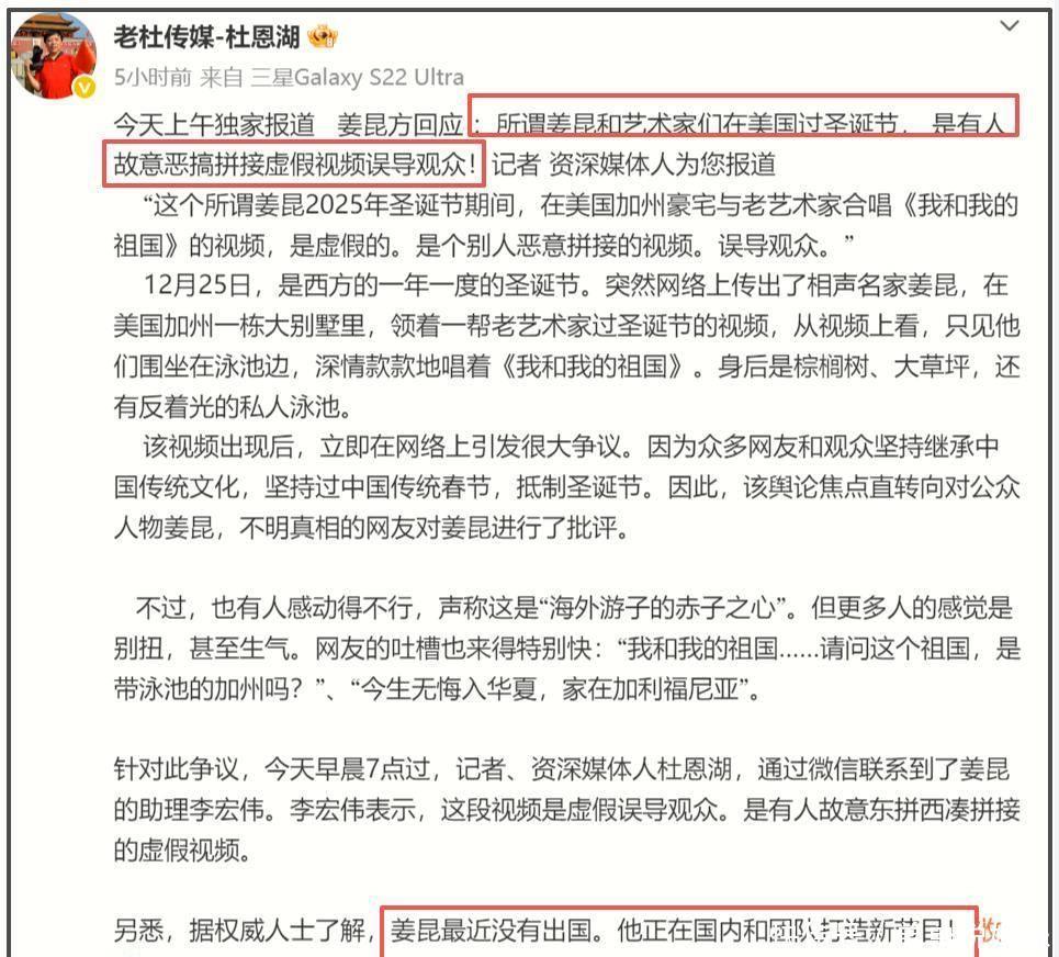 在一个视频中,75岁的姜昆和一群在美国的华人一起唱起了激昂的红色歌曲《我和我的祖国》,这首歌充满了正能量。然而,背景却是棕榈树、大草坪,还有一座私人泳池,反射着阳光。知情人士透露,这座大别墅正是姜昆在美国的住所。许多人看到视频后纷纷在姜昆的社交媒体账号下留言,但却发现评论区已经被关闭。网友们因此质疑姜昆心虚,批评声也越来越激烈。对此,记者杜恩湖透露,姜昆方面已经澄清,称视频的内容是被人故意恶搞、拼接而成的虚假信息,目的是误导观众。
