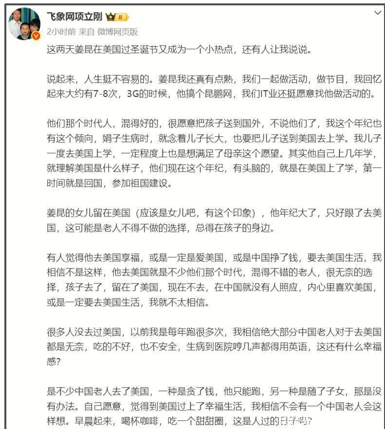 那么,姜昆为何会出现在美国看似过中秋节呢?他的朋友、飞象网的项立刚给出了答案。他表示,姜昆的女儿住在美国,年事已高的姜昆自然需要去陪伴自己的孩子。项立刚还提到,在那个年代,许多有成就的人都会把孩子送到国外,姜昆也不例外。项立刚自己也有一个儿子,他的儿子目前正在美国上学。然而,项立刚强调,真正有头脑的年轻人,通常在学成归国后都会选择回到中国,为国家的建设贡献力量。