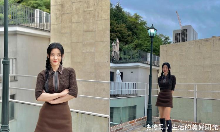 金裕贞以率性又带点女人味的造型诠释新风格,选穿黑色刺绣西装外套,立体的花卉线条为经典剪裁注入柔美细节,亮点在于内搭选择短版上衣,巧妙露出腰线,削弱西装的正式感,让整体更显利落轻盈。搭配焦糖色宽沿帽作为亮点,增添几分复古韵味与戏剧张力,既有气场又不失柔和,是展现个性又保留女性魅力的穿搭模板。金裕贞秋季穿搭公:针织上衣+牛仔短裙