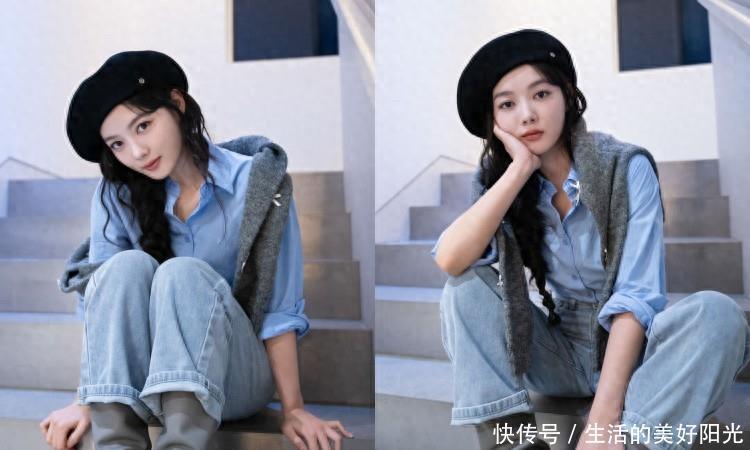 金裕贞以淡蓝衬衫搭配浅色牛仔宽裤,演绎早秋最经典的「法式休闲感」。她将灰色针织披肩随性披在肩上,增添层次与温柔气息,再以黑色贝雷帽点缀整体,瞬间散发出文艺与利落并存的氛围。这套穿搭在色调上维持冷色调一致,既清爽又不失秋意,宽裤线条拉长腿部比例,整体更显轻盈修长。金裕贞秋季穿搭公:针织上衣+A字裙+长靴